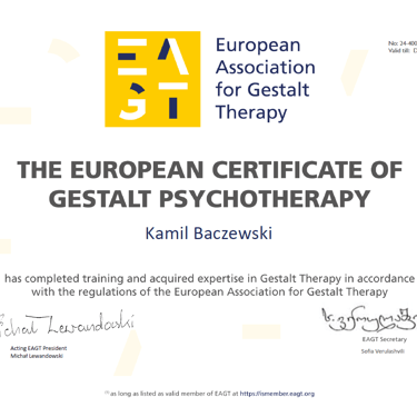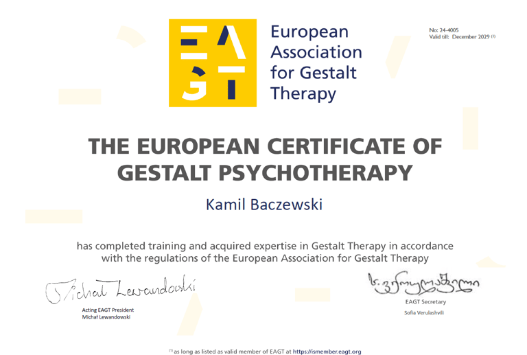 Nazywam się Kami Baczewski. Jestem psychologiem i psychoterapeutą gestalt. Ukończyłem szkolenie w Szkole Psychoterapii Gestalt w Warszawie, i uzyskałem certyfikat EAGT. Studia magisterskie kończyłem na Uniwersytecie Śląskim ze specjalnością psychologii klinicznej oraz psychologii zdrowia i jakości życia. W kręgu moich zainteresowań terapeutycznych szczególne miejsce zajmuje teoria pola.